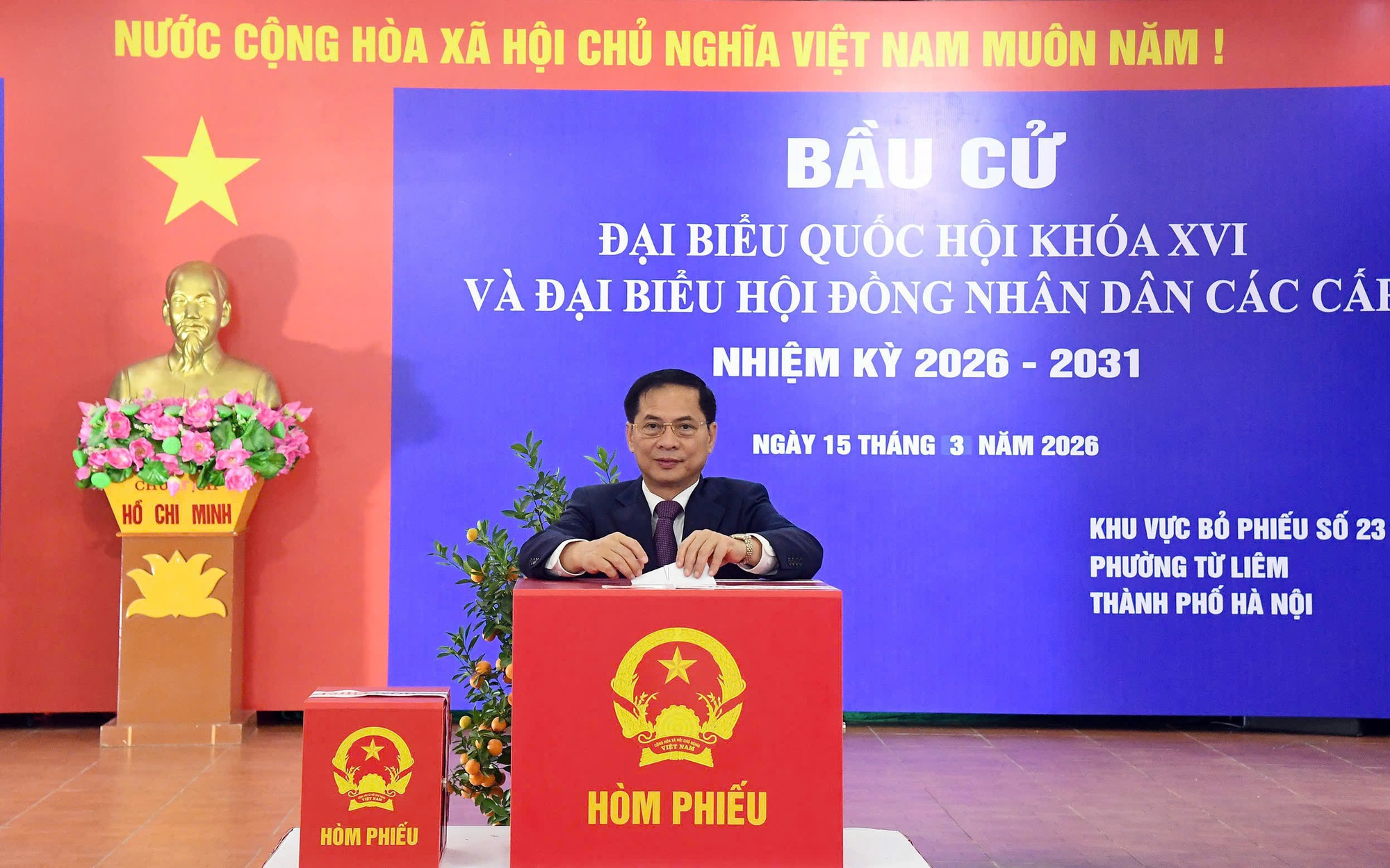 Đồng chí Bùi Thanh Sơn - Phó Thủ tướng Chính phủ nước Cộng hoà XHCN Việt Nam tham gia bỏ phiếu tại điểm bỏ phiếu số 23, phường Từ Liêm.